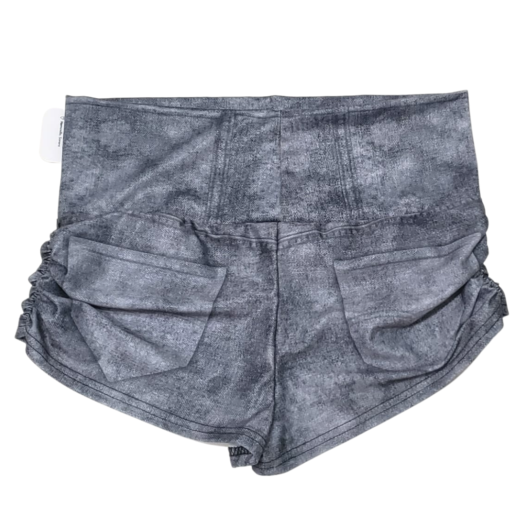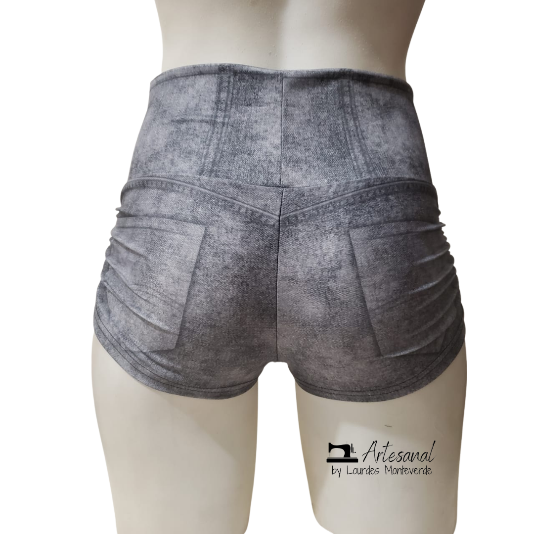 Short de licra estampada impresion mezclilla en color gris deslavado. Pretina alta. Elástico a los lados.